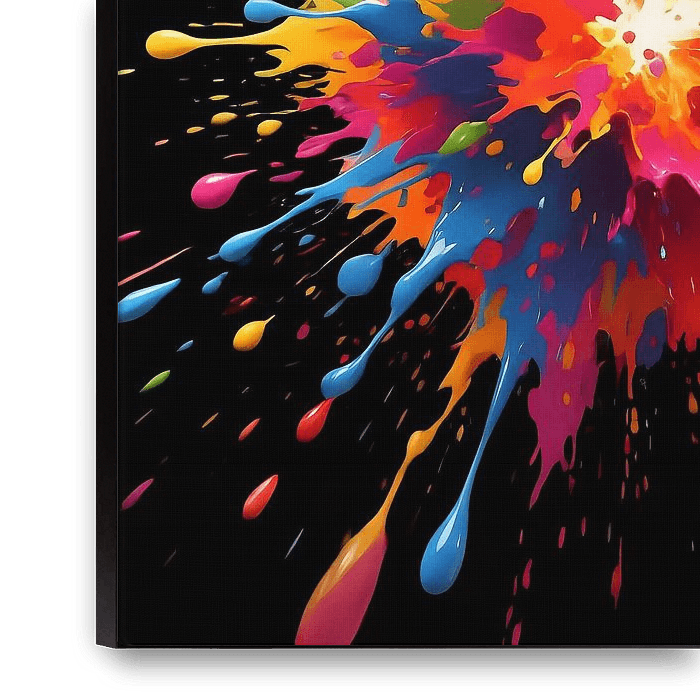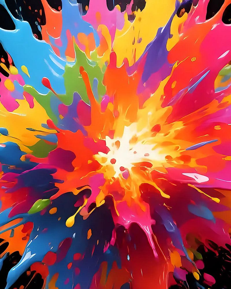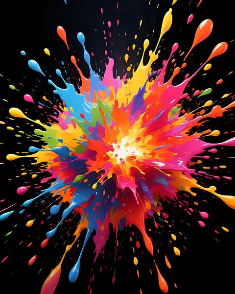An explosion of colour splashes - frozen in the moment - unfolds like a visual firework display full of energy and contrasts. From an invisible centre, drops, blobs and fine spray mist hurl in all directions; the forms range from thick, opaque dabs to semi-transparent washes of watercolour to thin, feather-light splashes. The colour…