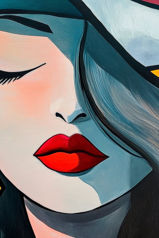 Vibrant colours merge in this work of art, which shows a fascinating woman with a large, stylish hat crown. Her expressive lips in a bright red colour and the geometric earrings give the picture a modern touch. This masterpiece will bring a zest to any living room and become an eye-catcher for stimulating conversation.