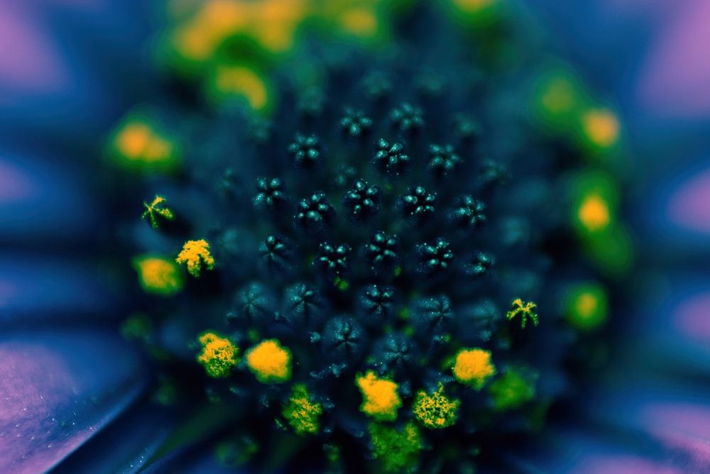An edited photo of a flower captured in close-up. The flower had beautiful shades of purple, pink and a green centre with yellow pollen-covered pistils. I edited it into an artistic composition by intensifying the colours of the buds ''draaien'' and adding a touch of blue.