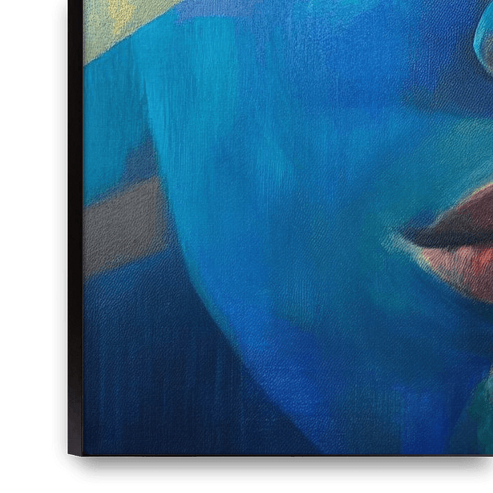 A fascinating interplay of colours and emotions unfolds here, with bright blue and yellow accents framing the face of a pensive young man. The clear expression and dynamic composition give this work of art an intense energy that is particularly effective in a modern living room.