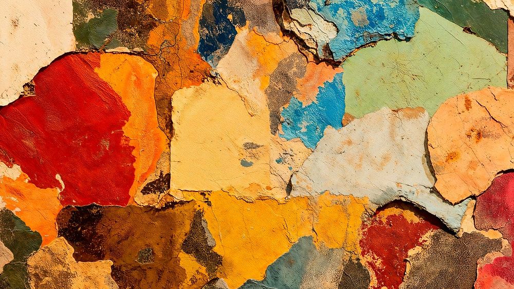 An abstract collage of torn, irregular pieces of paper in a varied colour palette. The edges of the paper pieces overlap and interlock, creating a textured, layered effect without a clear pattern. The overall composition is dynamic and chaotic, with the different colours and shapes blending together to form a visually appealing mosaic.