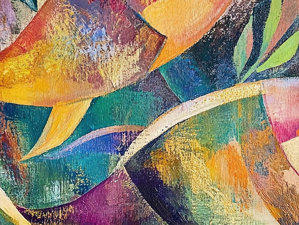 Details: fish, painting, art, colours, leaves, gold, abstract, cheerful, decorative, modern art