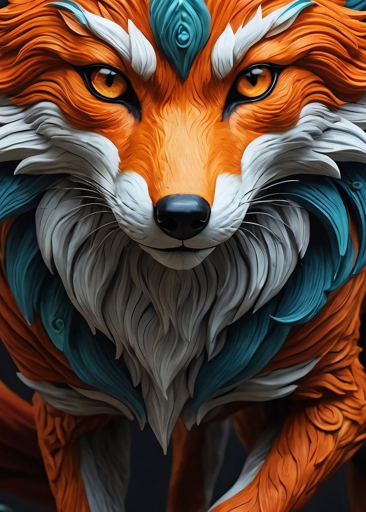 A colourful kitsune fox, trickster fox from traditional Japanese folklore, with orange and blue colours.