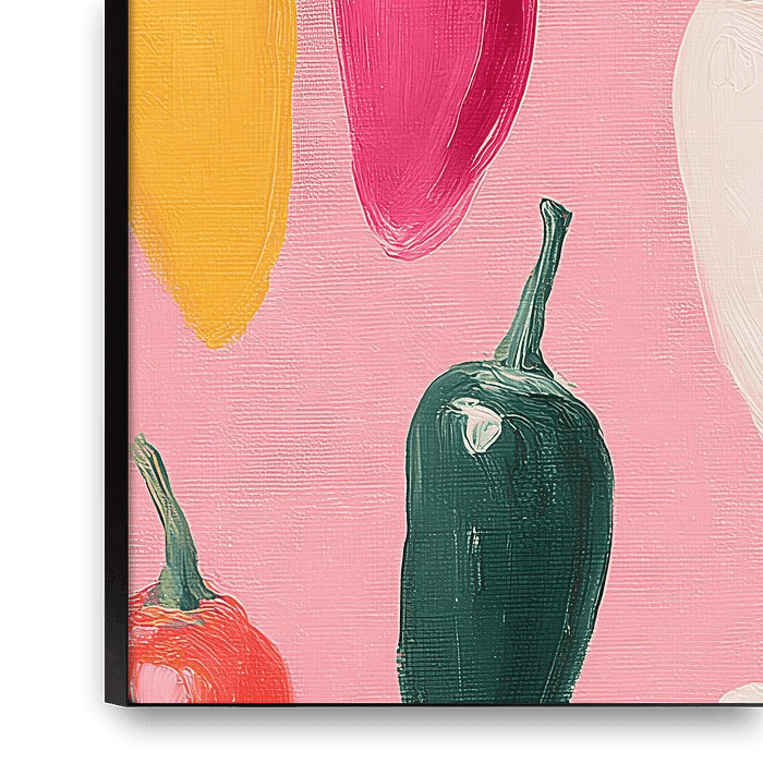 A cheerful and graphic artwork of peppers in different colours on a soft pink background. This piece exudes energy, creativity and playfulness and is perfect for a kitchen or interior that could use some colour.