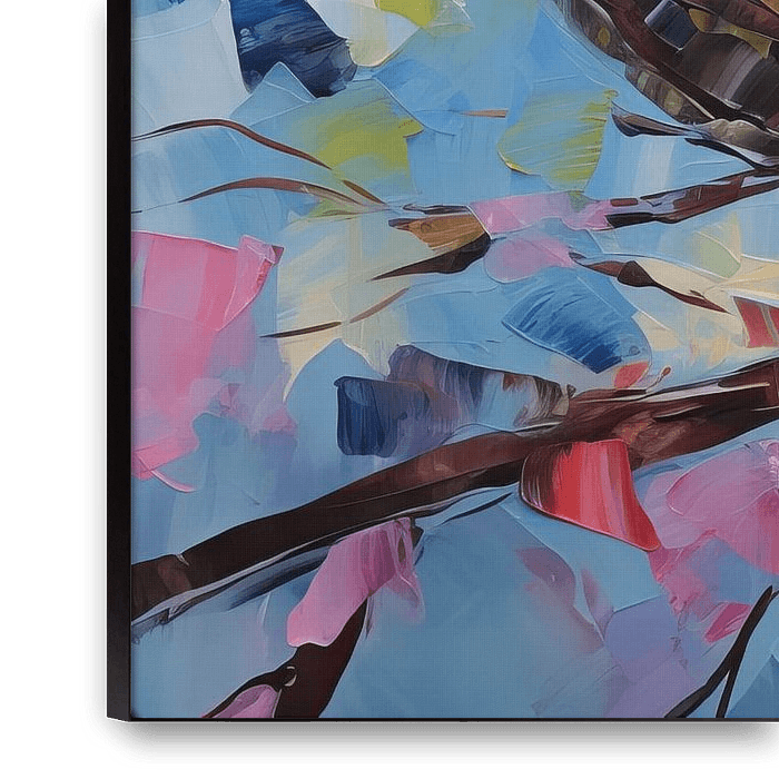 Colourful Plumage - Two birds, immortalised in a lively, impressionistic style, sit proudly on a branch. Their plumage, a mosaic of blue, orange and white, brings a playful interplay of colours to any space, while the background, a soft composition of pastel shades, creates a fresh, airy atmosphere.