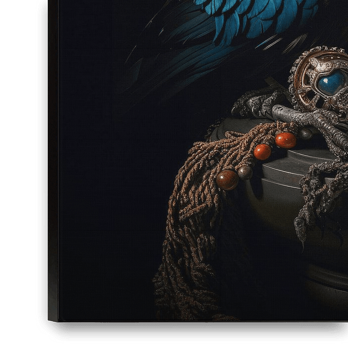 Colourful Precious is a detailed artwork by Olaf Kramer that combines the classical style of old masters with modern AI techniques to bring a still life to life. This work depicts a rich, visually opulent scene in which an exotic bird takes centre stage amidst various valuables.