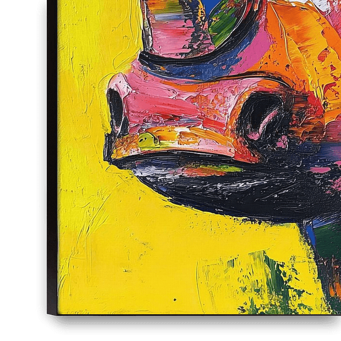 Colourful Rhino Head - This animal painting depicts a colourful rhino head, rendered in bright colours such as pink, yellow and blue, which together create a modern look.