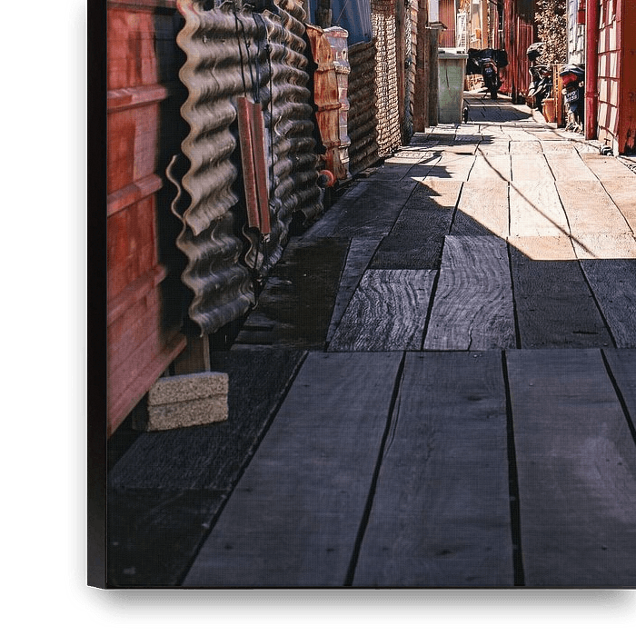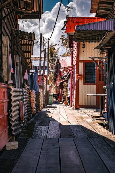 In this photograph, you are looking down a narrow street in George Town, Penang, where colourful wooden houses and various structures stand close together. The perspective of the path draws you, the viewer, straight into the street and creates a strong sense of depth. The warm sunlight falls on the façades, creating a beautiful…