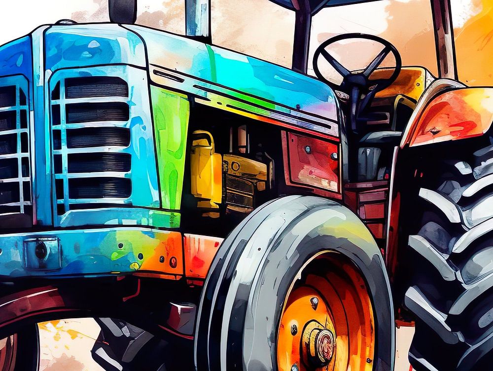 This vibrant painting of a colourful tractor brings a cheerful and playful energy to a child's room. The tractor takes centre stage on the canvas, and its body is painted in bright, uplifting colours such as bright red, sunny yellow and grass green. Every part of the tractor seems to glow with vibrancy.
