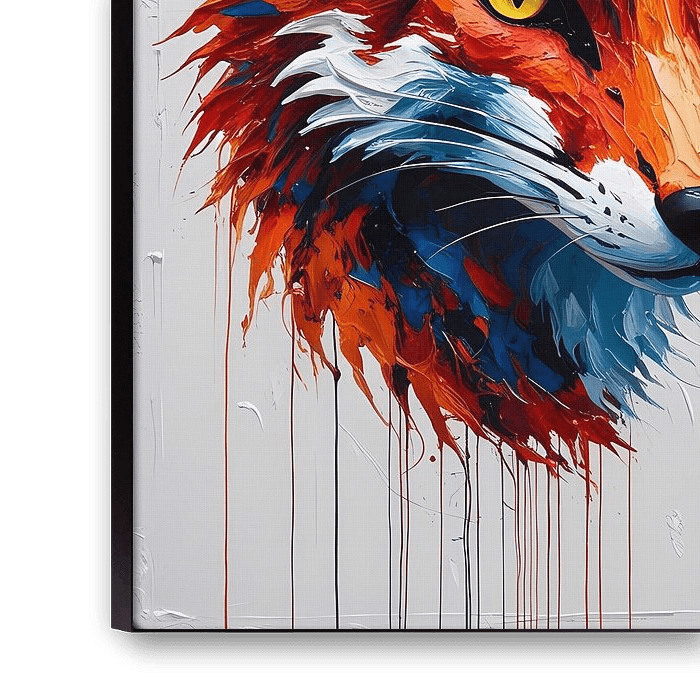 This colourful design shows the vivid head of a fox, depicted in an abstract expressionist style. The bright colours such as orange, red and blue jump off the canvas and bring the fox to life in a way that feels both dynamic and contemporary. The thick brushstrokes and the way the colours blend together give the feeling that the fox is almost in motion. This artwork would fit perfectly in a modern space where it can be a striking eye-catcher. The design combines the wild beauty of nature with an artistic flair that highlights the artist's creativity and expression.