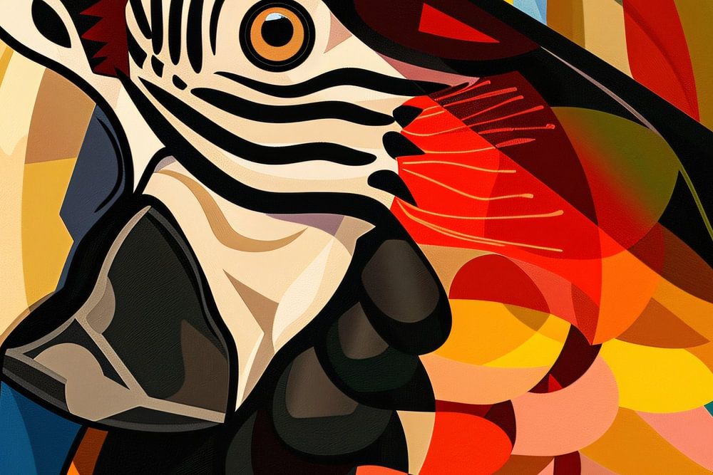 This striking artwork captures the essence of a colourful parrot in an abstract and modern style. The vibrant colours, including deep shades of red, yellow, and blue, create a dynamic and energetic look. This design combines elements of cubism and pop art, making it perfect for eclectic interiors. The parrot, a symbol of exotic beauty and freedom, comes to life in an explosion of colours and shapes that invite the viewer to look longer and discover more. Ideal for those looking to make a statement in their home, this artwork is sure to bring a touch of tropical flair and artistic expression to any space.