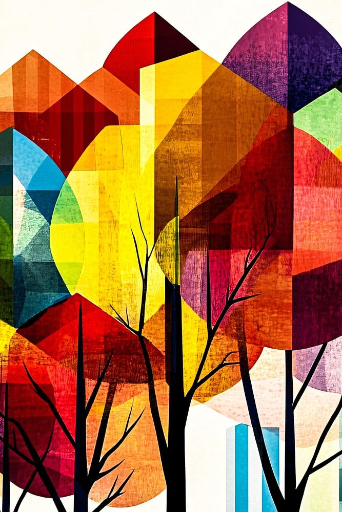 This unique design combines an urban landscape with colourful, abstract trees in geometric shapes. The playful colours and striking use of cubist elements make this artwork perfect for modern interiors. It offers a refreshing mix of nature and urban architecture, making it a captivating eye-catcher in any space. Ideal for lovers of contemporary art and dynamic compositions.