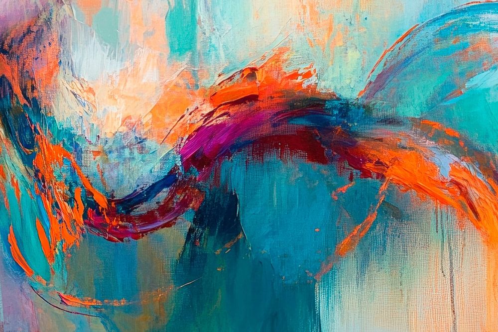 A vibrant play of colours consisting of bright orange, soft blue tones and a hint of turquoise casts a spell over the viewer. The dynamic brushstrokes convey a sense of freedom and movement. This work of art is ideal for the living room, where it creates conversation and promotes an inviting atmosphere.