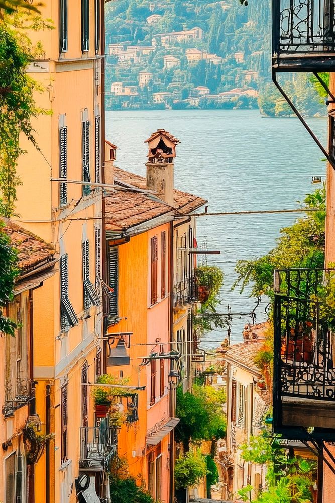 A picturesque labyrinth of alleyways nestles gently against the hillside, while lively yellow houses with wrought-iron balconies stand harmoniously together. The lake glistens in the distance, framed by gentle mountains, while nostalgic lanterns on the walls surrounded by lush greenery enchant the ambience. A place that whispers stories and invites you to discover.
