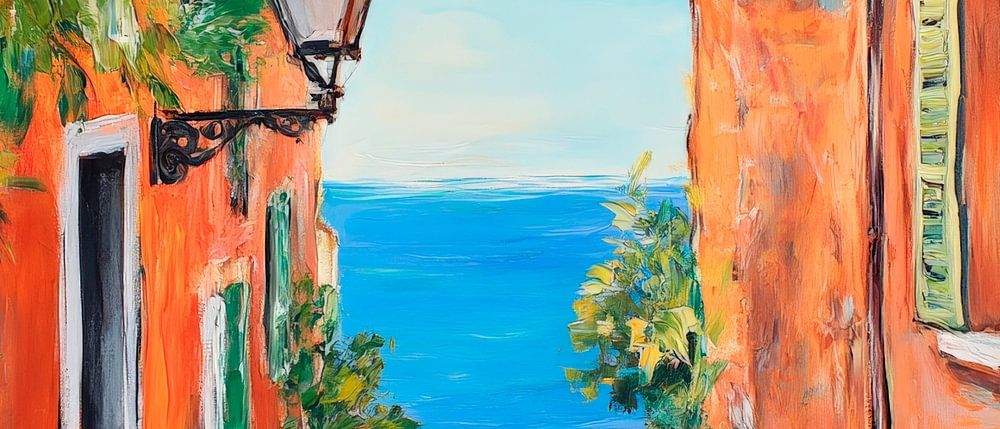 A picturesque passageway, surrounded by vibrant orange-coloured walls, invites you to dream. The gentle waves of the sea sparkle in the background, while the vintage shutters are charmingly open. This work of art lends the living room an inviting atmosphere and creates a holiday mood within your own four walls.