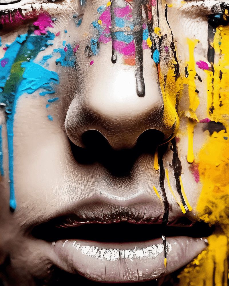 Colourful and particularly modern portrait, close-up. Partly black and white (the face itself) and partly full of colour due to the paint dripping off the face. Digital art, pop art style.