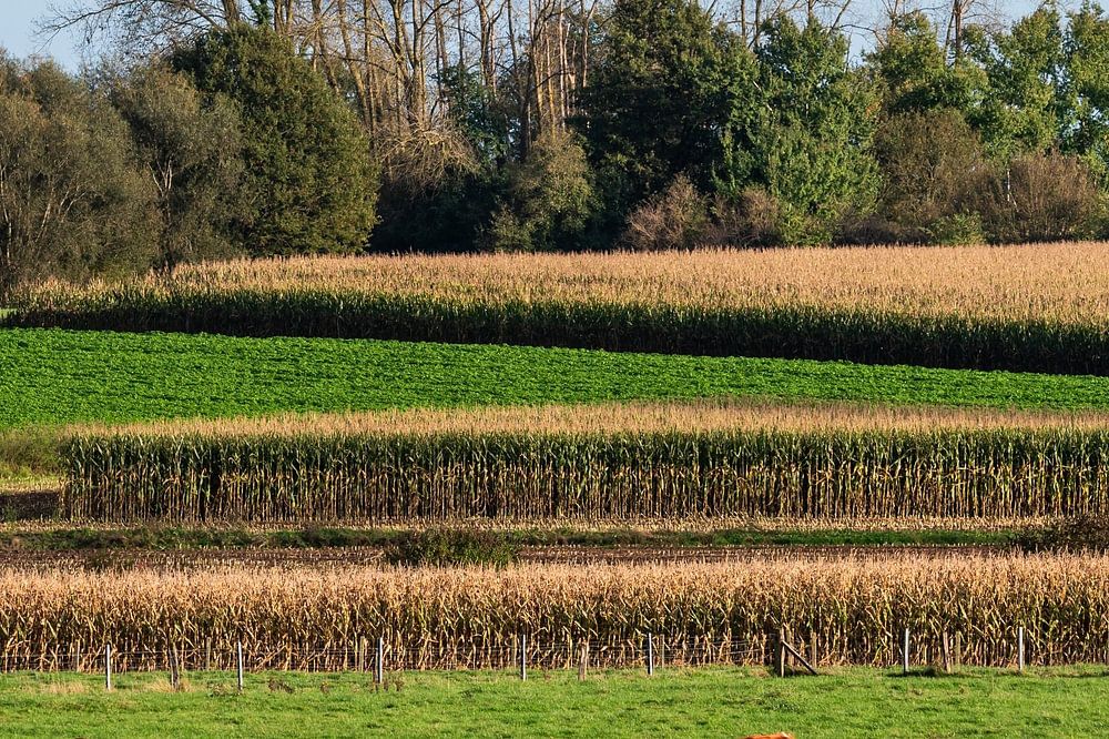 A beautiful carpet of colour in the Pajottenland. A patchwork of wheat, grass and maize fields provide beautiful shades of colour. The cows can still enjoy the autumn sun for a while.