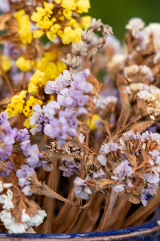 This charming picture shows a colourful bouquet of dried flowers arranged in a shiny blue pot. The vibrant colours of the flowers, including yellow, purple and white, stand out beautifully against the background and create a warm, inviting atmosphere. Perfect for flower and decoration lovers who appreciate the timeless beauty of dried flowers. This picture will bring colour and natural elegance to any home.