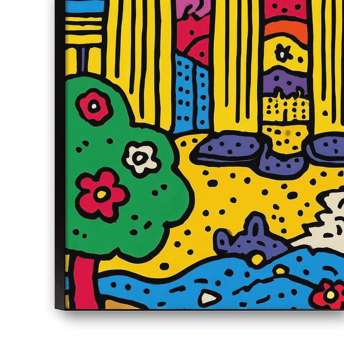 Cheerful cartoon illustration of the Brandenburg Gate in Berlin with bold lines and bright colours. Surrounded by rainbows, flowers, trees and a smiling sun motif, the iconic building is given a friendly expression. The motif radiates joy, liveliness and playful charm and at the same time conveys German culture in a colourful, childlike and playful way.