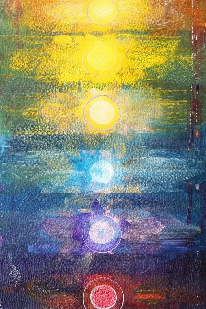 This painting shows an abstract depiction of chakras, represented by vertical layers of colour in bright blue, purple, yellow and red. The depiction is reminiscent of a spiritual journey through the energy centres of the body and radiates a warm, healing effect. Ideal for rooms with a spiritual or meditative character.
