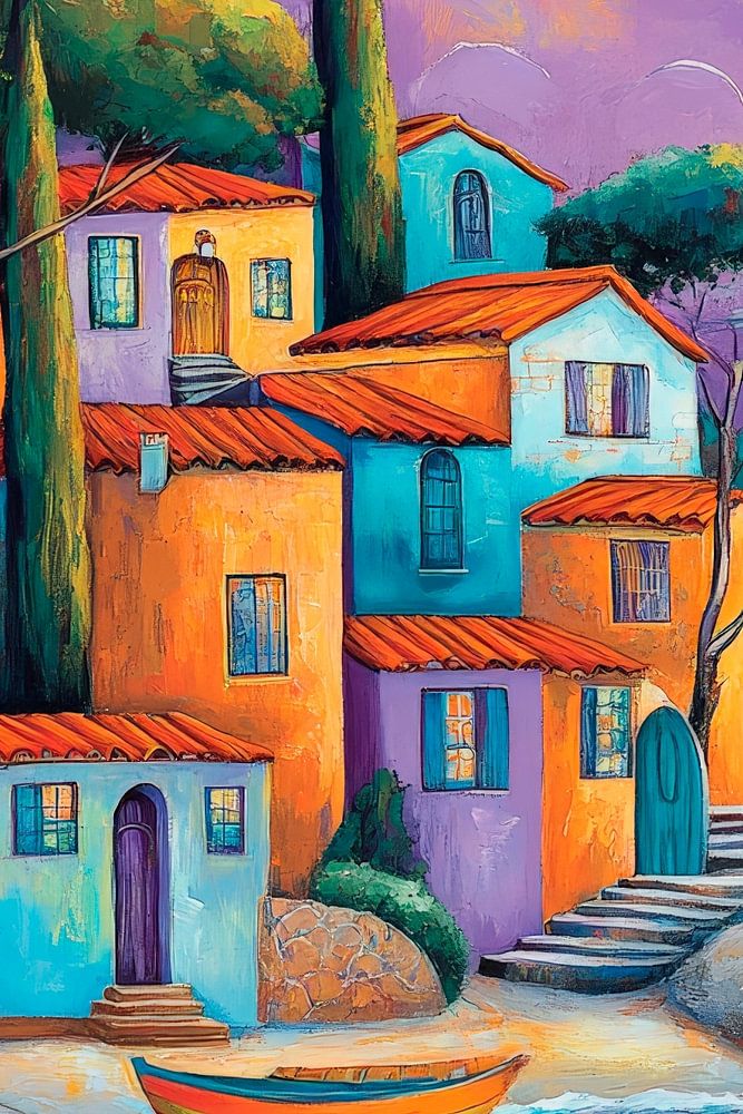 A dream of vibrant colours, where gentle waves meet picturesque houses that glow in the soft tones of dusk. The harmonious combination of water and architecture creates a romantic atmosphere. Ideal for the living room, this artwork brings a sense of calm and relaxation to any room.