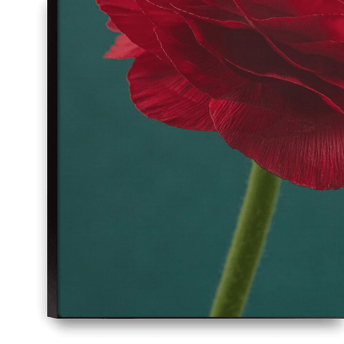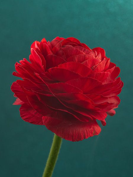 Buy this flower art Colourful contrast: Red Ranunculus with petrol-coloured background by Marjolijn van den Berg on canvas, ArtFrame, poster and wallpaper, printed on demand in high quality.