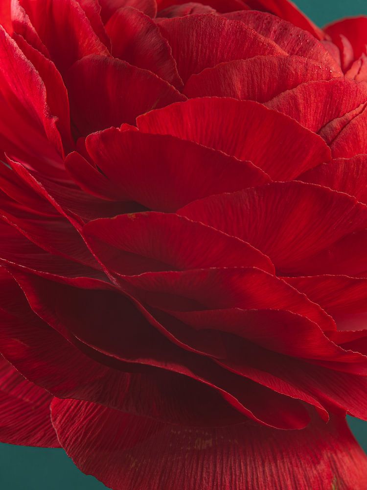 This photograph: "Kleurrijk contrast: Rode Ranonkel met petrol kleurige achtergrond" is a photograph I took of a beautiful red ranunculus with petals that are beautifully wide open. This flower is set against a petrol-coloured background.