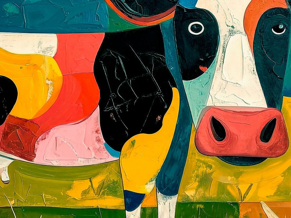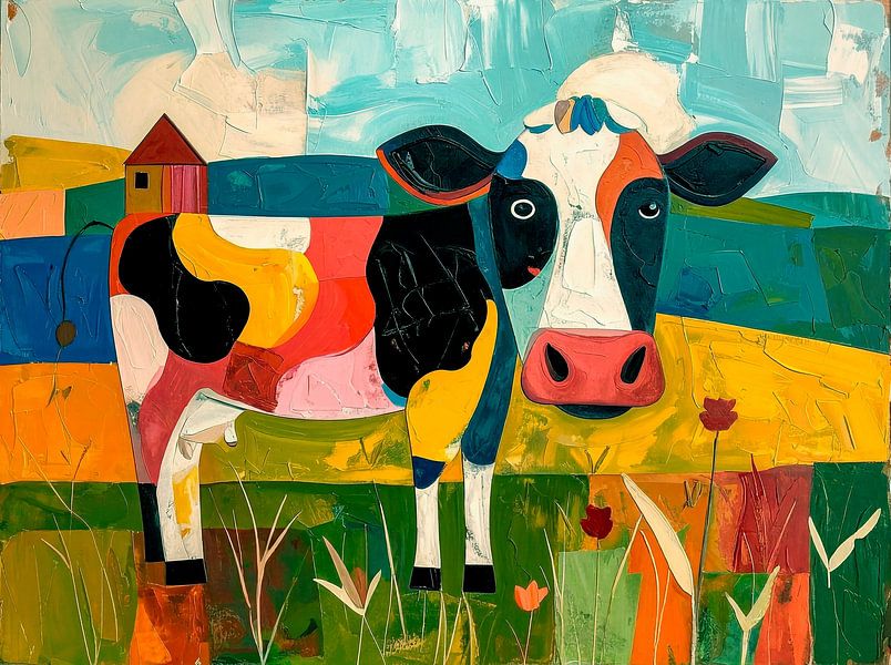 A cow. In a meadow. With a textured paint finish and lots of colours. In real life, you might be startled by the sight of this colourful cow, but in a picture it has a friendly and cheerful look.
