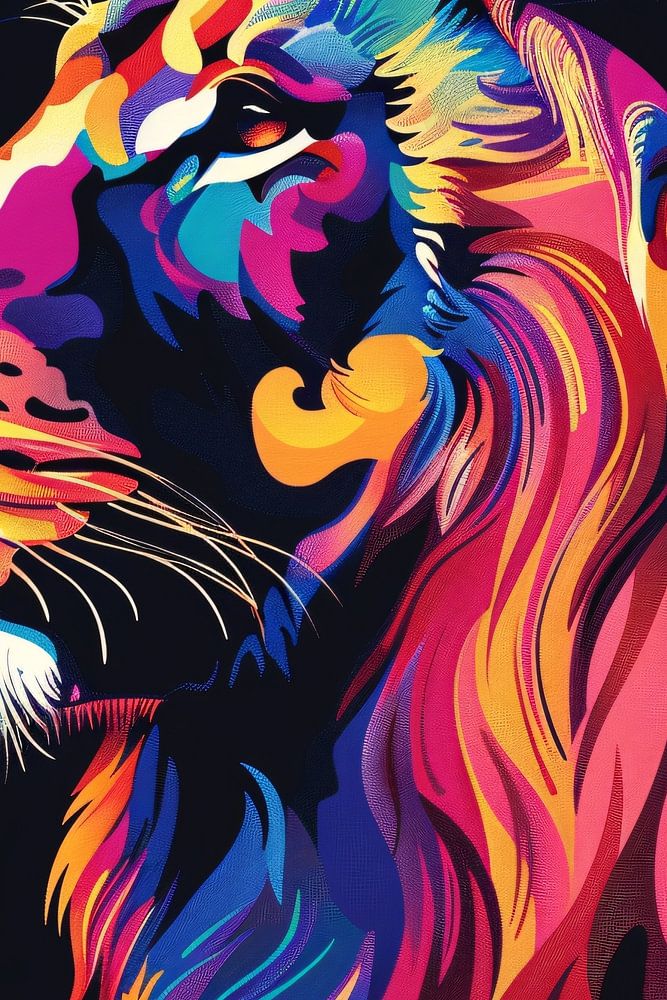 Enrich your interior with an explosion of colour and vibrancy! This digital art print of a majestic lion brings a touch of exotic energy to any room. The vibrant colours and bold lines create a striking focal point that attracts attention and stimulates conversation. Perfect for lovers of Modern art and animal lovers, this print adds a unique touch to your home or office. Be inspired by the power and beauty of nature, captured in a contemporary masterpiece.