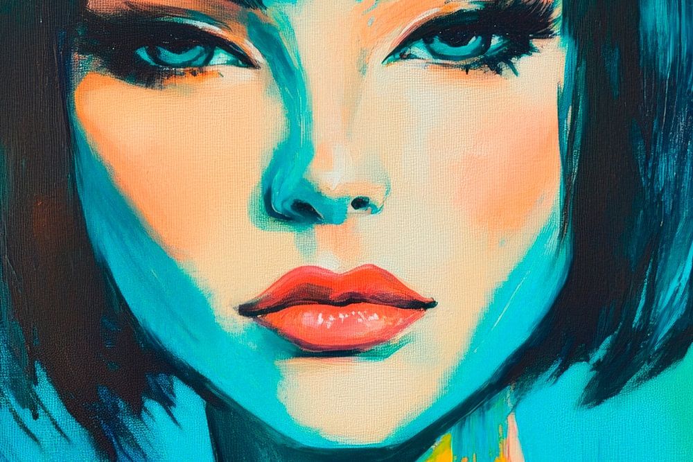 A fascinating portrait that shines with vivid colours and striking contrasts. The person's soft, expressive features radiate self-confidence and creativity. The combination of cool blue and warm colour palette adds a modern touch to any room. Ideal for a living room, where it stimulates conversation and enlivens the atmosphere.