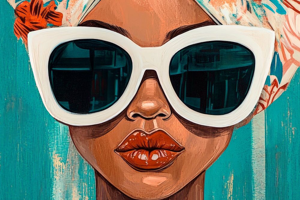 A radiant portrait full of joie de vivre and style! With her colourful turban and striking sunglasses, the sitter radiates a relaxed elegance. The vibrant colours of the background add a touch of freshness to any room. Ideal for the living room or creative space, this artwork creates an inviting and inspiring atmosphere.