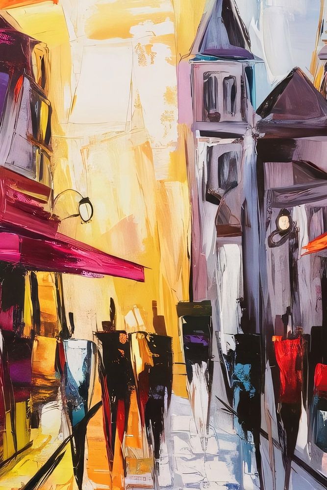 This vibrant painting depicts a bustling city street in bright colours. The abstract style, combined with bright hues such as red, yellow and purple, brings a dynamic atmosphere to life. People move through the street, while the buildings around them glisten in the light of the street lamps. The reflections on the wet pavement add an extra layer of depth to the scene. This artwork is perfect for modern interiors looking to add colour and energy. It combines the charm of a European city with a unique, contemporary artistic vision, making it a perfect addition to a living room or dining room.
