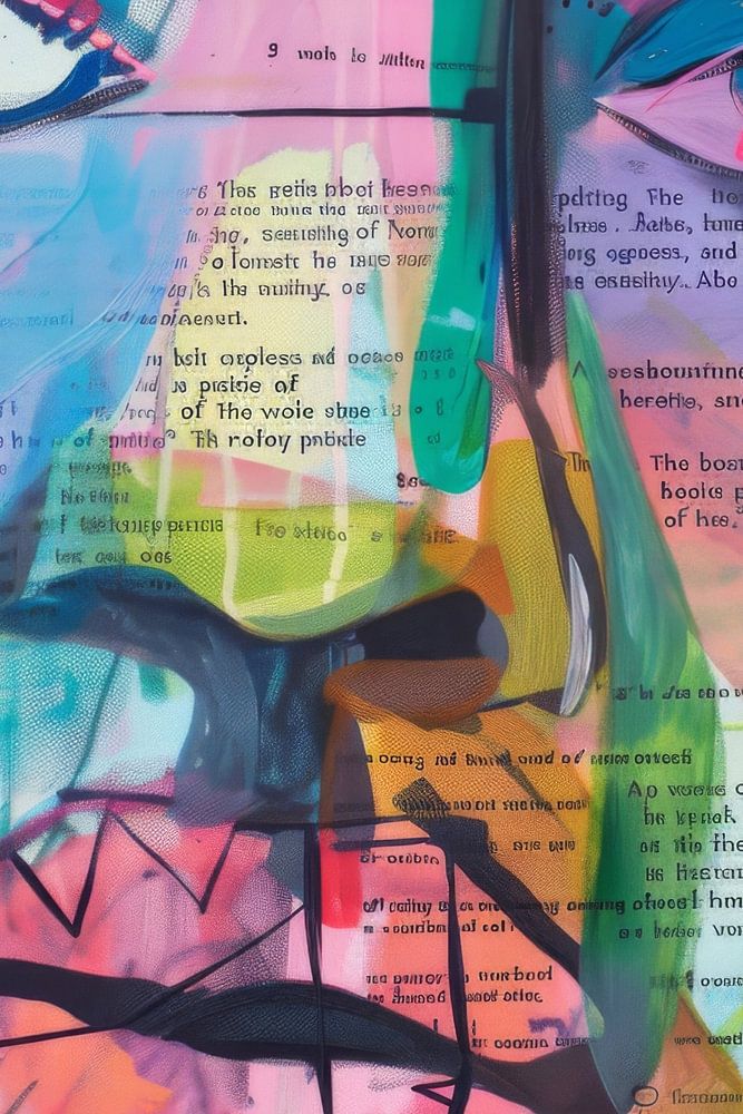 The picture shows a colourful portrait with abstract features and bold colours. The striking eyes and emphasised mouth immediately attract attention. Overlaid text passages and geometric elements add an interesting dimension that emphasises the emotional depth and complexity of the depiction.