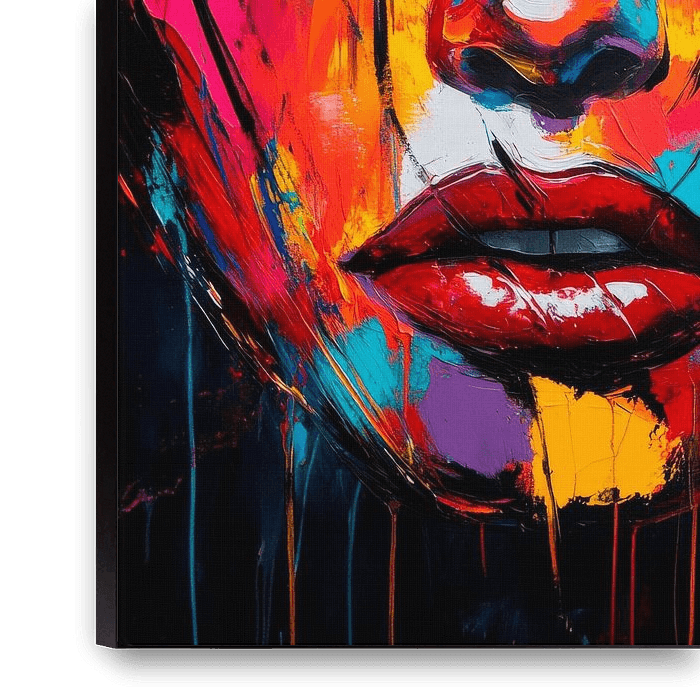 A fascinating interplay of bright colours and expressive eyes captivates the viewer. The dynamic drops of colour give the face a lively depth and intensity that reflect emotions. This mesmerising art is perfect for a modern living room, where it can stimulate and inspire conversation.
