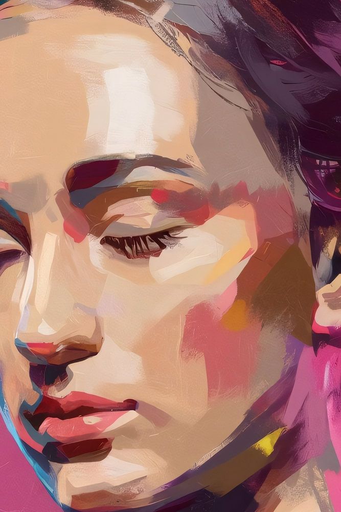 This artwork depicts an expressive and colourful portrait of a woman, rendered in a modern, digital style. The bold brushstrokes and harmonious mix of warm and cool tones create an intriguing visual experience. The woman's face exudes calm and elegance, while the abstract influences give the artwork a contemporary feel. This creation would fit beautifully in a modern bedroom or office space, offering a touch of colour and emotion to any wall. This unique portrait is ideal for lovers of digital art and abstract expressionism.