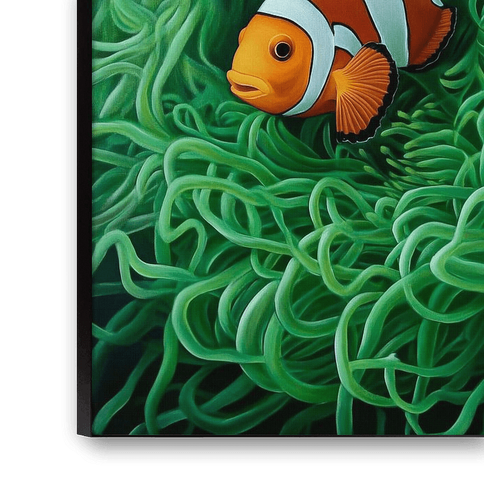 The picture shows two lively clownfish swimming protectively in the dense, green growth of an anemone. Their bright orange-coloured bodies and characteristic black stripes stand out in the fascinating surroundings, which are filled with winding, long plant structures. This harmonious underwater world radiates an inviting calm and blaze of colour.