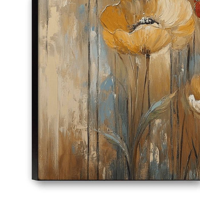 Details: flower painting, poppy, abstract flowers, texture, vibrant colours, yellow, blue, orange, beige, cream