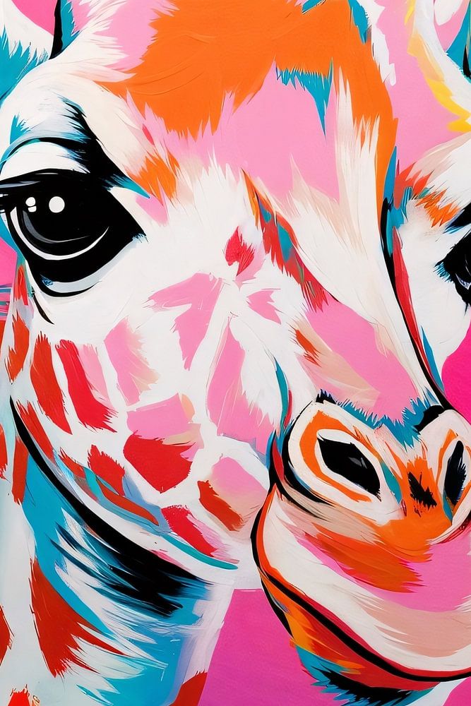 This striking painting of a giraffe brings a touch of playfulness and vibrancy to any room. With its bright pink, orange and blue hues, and a unique pop-art look, this artwork instantly grabs attention. The design is perfect for lovers of contemporary and modern art who want to add a touch of colour and character to their interiors. The detailed look of the giraffe against the colourful background creates a dynamic effect that looks both cheerful and stylish. Hang it in your bedroom, office or living room and let it be a striking eye-catcher that brings any space to life.