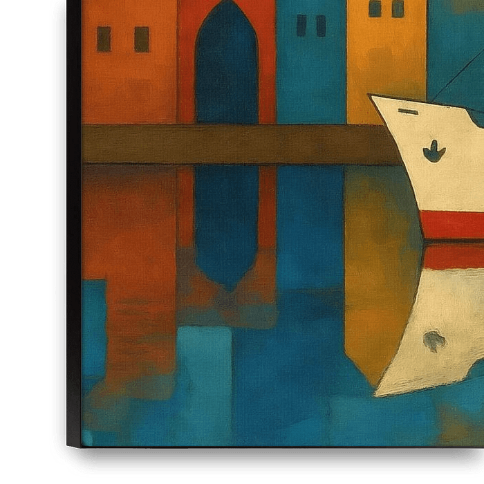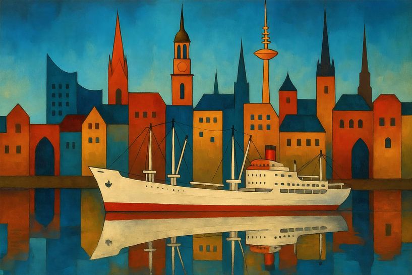 A colourful city and harbour motif that combines clear shapes, bold colours and maritime elements. A large white ship is moored in front of a lively city backdrop with towers, domes and modern buildings. The reflection in the water enhances the graphic effect and adds depth to the image. This artwork combines urbanity, the joy of travel…