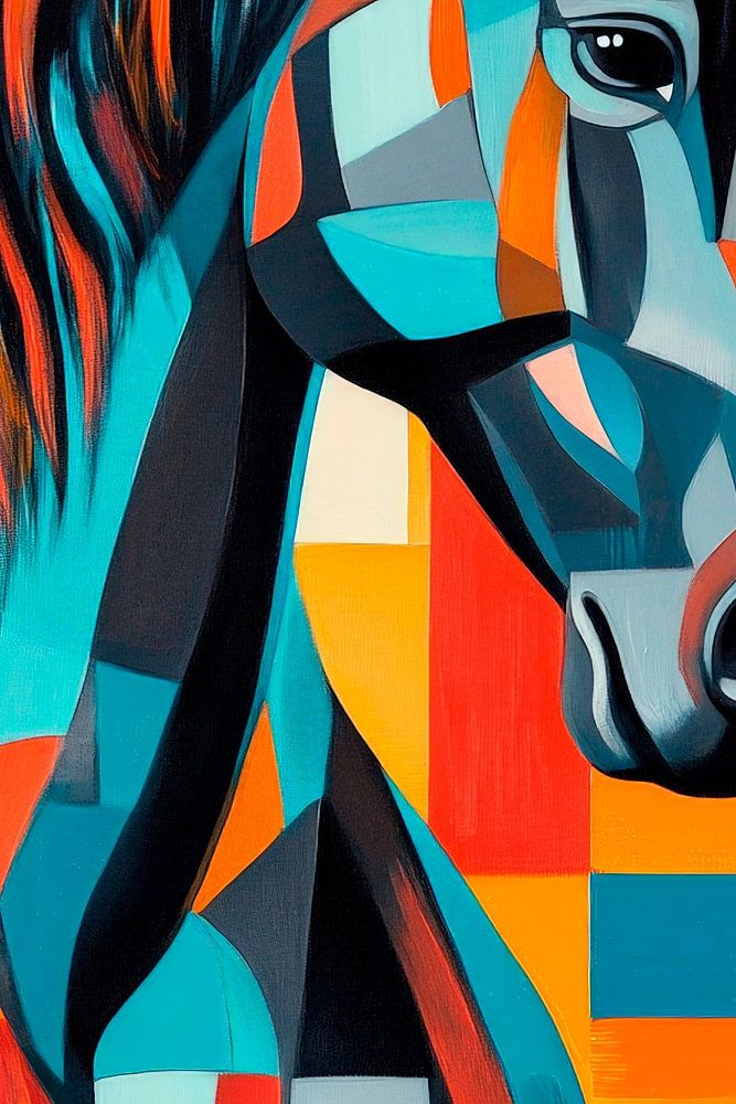 With bold colours and geometric shapes, the horse portrait evokes lively emotions. The dynamic composition radiates elegance and strength, while the harmonious blue tones draw the eye. This work of art is the perfect addition to a living room or office, where it creates an inspiring and creative atmosphere.