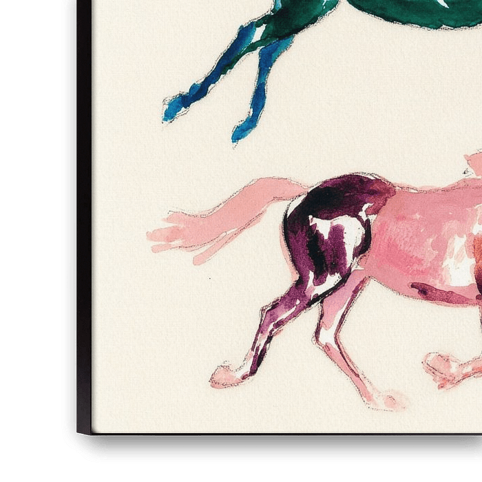 A dynamic and joyful work of art, executed in loose, expressive watercolour techniques. This piece shows three beautiful horses galloping side by side, each in a unique, bright palette: a golden yellow, a deep turquoise/blue-green and a vibrant pink/magenta variety. The movement and unusual colours give this work a modern and energetic look, ideal for a statement on any wall.