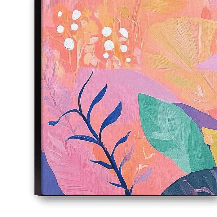 Colourful Hummingbird in Garden - This painting shows a cheerful hummingbird with brightly coloured wings flying among colourful leaves and flowers, all against a soft pink background, giving off a happy summer garden atmosphere.
