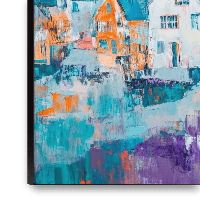 Liven up your room with a harmonious interplay of soft pastel colours and vibrant accents. The stylised houses seem to float in the light of dusk, while the vibrant colours radiate an inviting warmth. Ideal for the living room, where it combines cosiness and creativity.