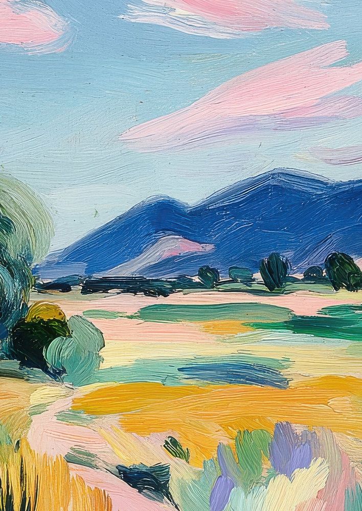 This oil painting in the style of Henri Matisse shows a lively landscape with green fields, mountains and a path lined with colourful wildflowers. The sky is a vibrant pink colour and distant buildings can be seen in the background. Large, dynamic brushstrokes and thickly applied paint create high contrast and intense colour. The composition celebrates the beauty of nature and light in vivid, impressionistic colours. A strong visual impact is created by the harmonious combination of landscape elements, floral details and luminous sky, making the scene energetic and inspiring.