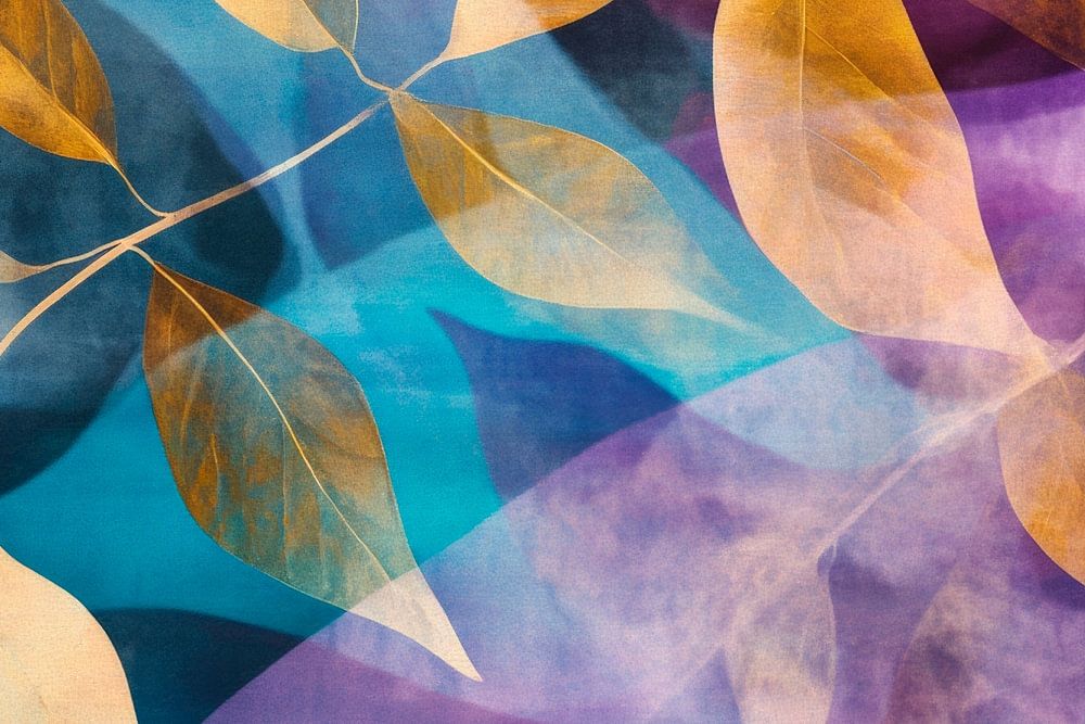 Soft colours blend harmoniously and create a calming atmosphere. The curved lines and golden leaves lend the whole an elegant lightness. This work of art finds its perfect place in the bedroom, where it promotes peace and harmony while adding a touch of natural beauty.