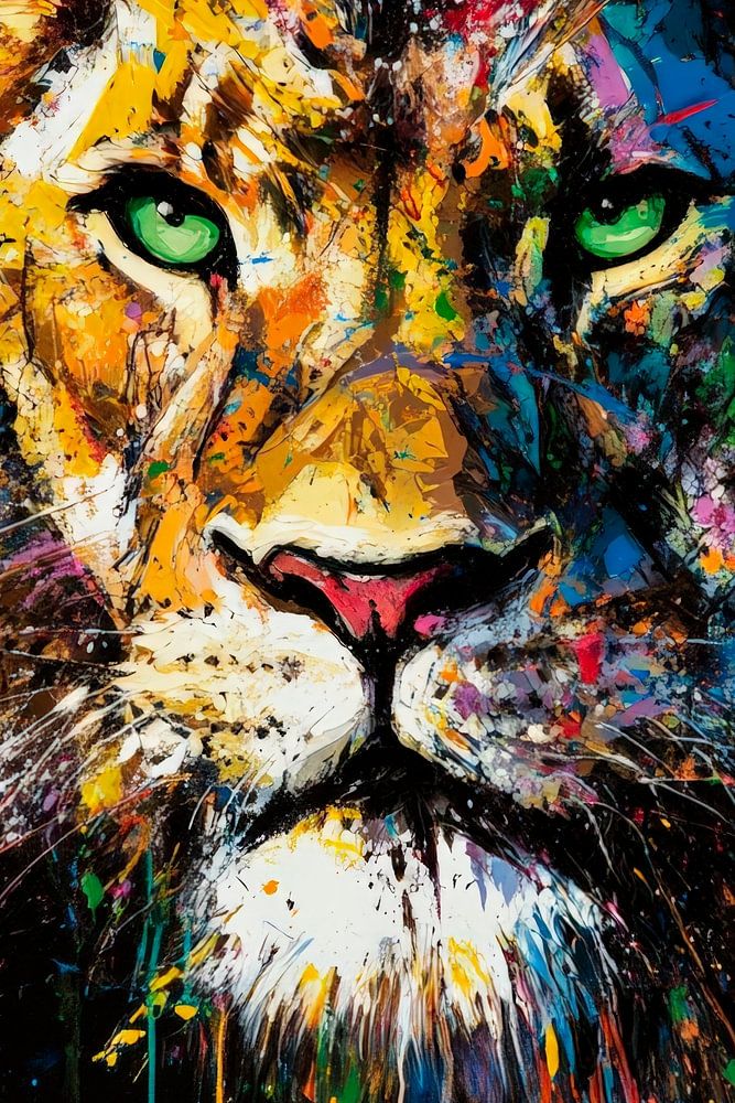 A powerful lion's head stands out, surrounded by vibrant splashes of colour that radiate dynamism and energy. The bright green eyes mesmerise the viewer and convey strength and ferocity. This expressive work of art would be an impressive eye-catcher in a modern living room or a creative corner in the office.