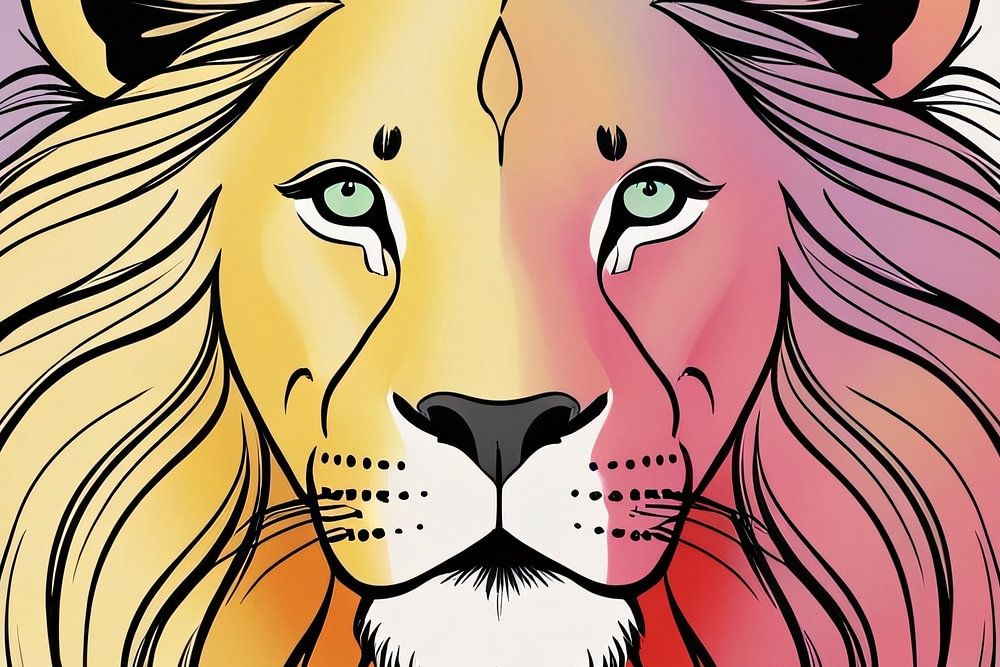 This striking design depicts a majestic lion with a beautiful mix of soft yet vibrant colours. The symmetrical composition and flowing lines give the image a serene look. The background in soft pastel shades accentuates the lion's colourful mane, which range from warm yellows and oranges to cool tones such as pink and green. This artwork could enrich a modern space, for example in a living room or office, where it can serve as a striking focal point. The design exudes strength and elegance, and the playful colour combinations bring a dynamic and contemporary feel to any room.