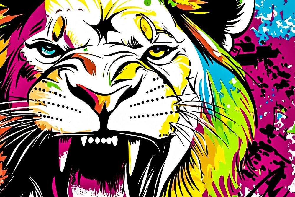 This eye-catching wall decoration brings energy and colour to any room. The design shows a vibrant lion in a dynamic Pop Art style, with an explosion of bright colours and expressive details. Perfect for making a statement in your interior and creating a unique atmosphere. Ideal for modern living rooms, offices or creative spaces. Be inspired by this artwork that exudes power and creativity.