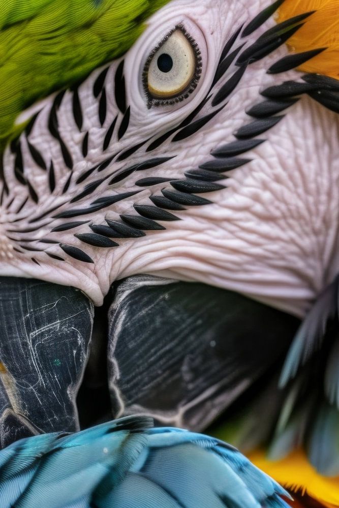 The picture presents an impressive macaw, whose vivid colours and artistic feather structure captivate the eye. The bright blue and vibrant yellow colours are particularly striking and contrast harmoniously with each other. Its inquisitive, expressive eyes also lend it a charming character, while the curved beak emphasises its majestic appearance.