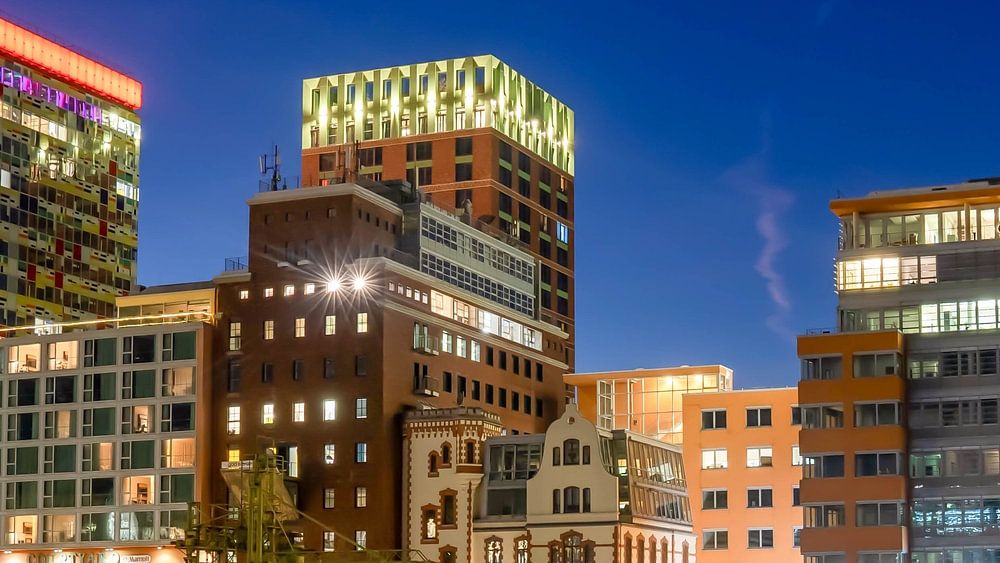 A really colourful HDR image from Düsseldorf's Media Harbour - the contrast in the blue hour is just great to look at.